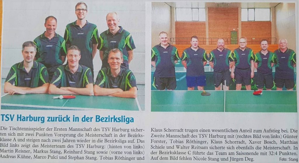 Die 2. Mannschaft des TSV Harburg spielt eine beeindruckende Saison in der Herren Bezirksklasse B Gruppe 5. Mit 17:9 Punkten steht das Team derzeit auf einem starken zweiten Platz hinter dem ungeschlagenen VfB Oberndorf. Die Harburger kämpfen um eine Top-Platzierung und um den Aufstieg in die Bezirksklasse A. In den letzten Spielen gab es einige spannende Duelle. Während das Team gegen SC Athletik Nördlingen II (4:6) und TSV Wemding II (3:7) Niederlagen hinnehmen musste, konnte es gegen den FC 1929 Mertingen II mit 6:4 einen wichtigen Sieg einfahren. Die nächsten Begegnungen werden über den endgültigen Tabellenplatz entscheiden. Mit einer geschlossenen Mannschaftsleistung und viel Teamgeist bleibt das Ziel zum Aufstieg!